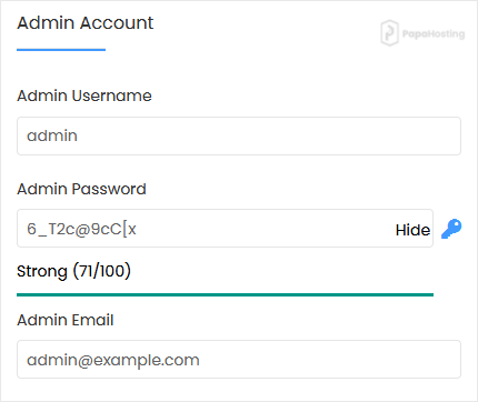 - Admin Username: Your new Microweber username (for security reasons, do not use the administrator or the admin username).